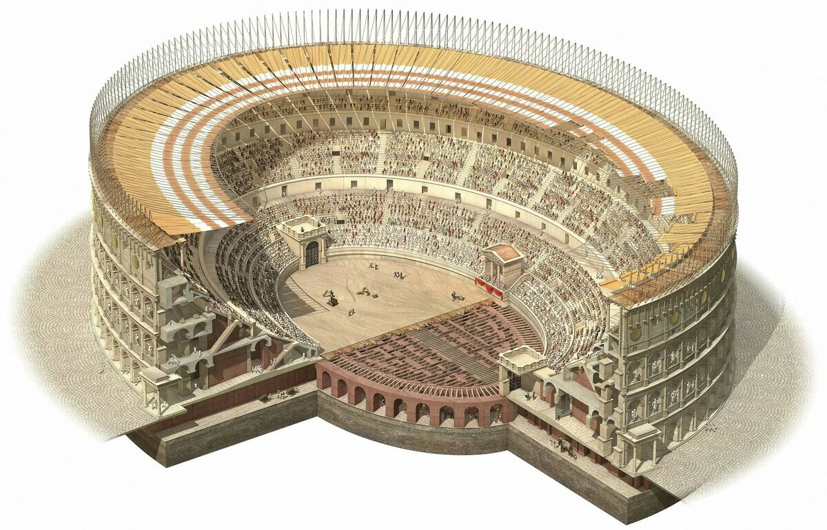Самым большим античным амфитеатром считается римский Колизей. В плане Колизей представляет эллипс размерами 188 на 156 метров, что позволяло в античное время вмещать 50 000 зрителей.